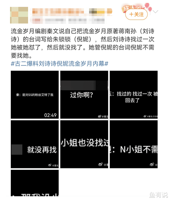 起因是她找的枪手不专业,把原著蒋南孙(刘诗诗饰)的台词,张冠李戴到了朱锁锁(倪妮饰)头上。