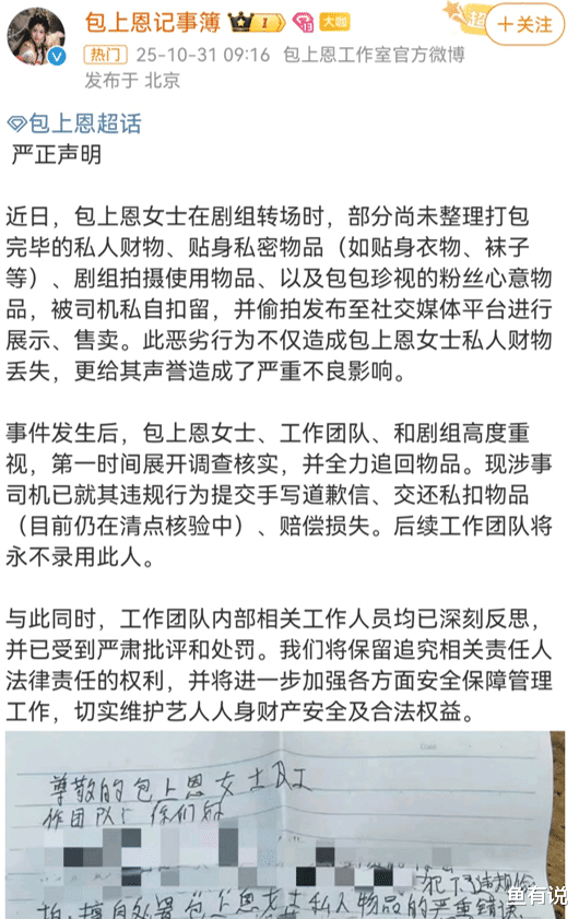31日凌晨,演员包上恩工作室突然发公告,称演员的私密物品及粉丝送的礼物等,都被司机给私自扣留并挂网售卖了。
