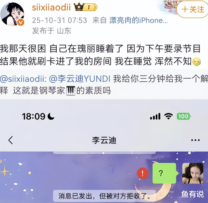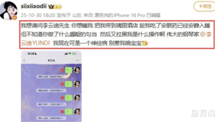 曾剑指秦霄贤,和李汶翰的网红司晓迪再度开腔,喊话钢琴王子李云迪出来道歉,称:对方趁自己服用安眠药后偷摸进屋内、并做了一些不好的事,事毕后又拉黑不给说法。