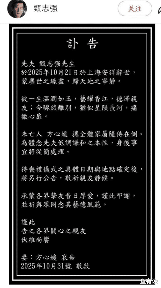 其夫人方心媛于上午十点发布讣告,称先夫甄志强在10天前去世了,走得很安详,作为未亡人她叩谢亲朋好友们的厚爱,会择期举办送别仪式。