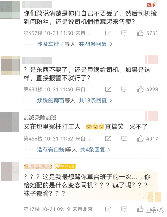 比如某段时间她的站姐集体脱粉、爆出来的“被扣留”的物品,不太像私人用品而是粉丝赠物,事后不报警的异常处理方式等等,都让粉丝开始怀疑司机是背锅侠。